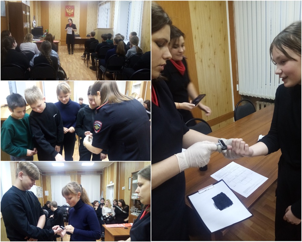 Специалист ГРЛС, Анастасия Александровна Шадрина, рассказала о профессия, которые можно получить в вузах МВД России, познакомила с понятием «дактилоскопия». Все ребята с интересом снимали отпечатки пальцев и вместе сделали дактокарту.