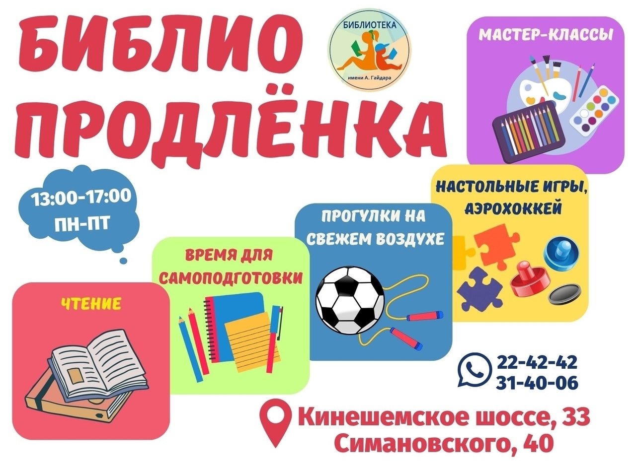 В областном центре проект «Библиопродленка» реализуется на базе ОГБУК «Костромская областная библиотека для детей и молодежи имени А. Гайдара» по адресам: г. Кострома, Кинешемское шоссе, 33; ул. Симановского, 40, а также на базе семи библиотек МБУ г. Костромы «Централизованная библиотечная система».